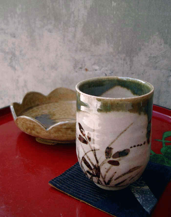 織部の特徴である緑色がやわらかくとけて、ちょっと和の雰囲気です。他に秋草文や麦の絵など季節の草花が描かれた柄違いもあります。